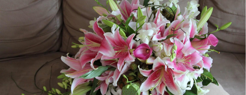 Сборный букет из лилий, маттиолы и эустомы..